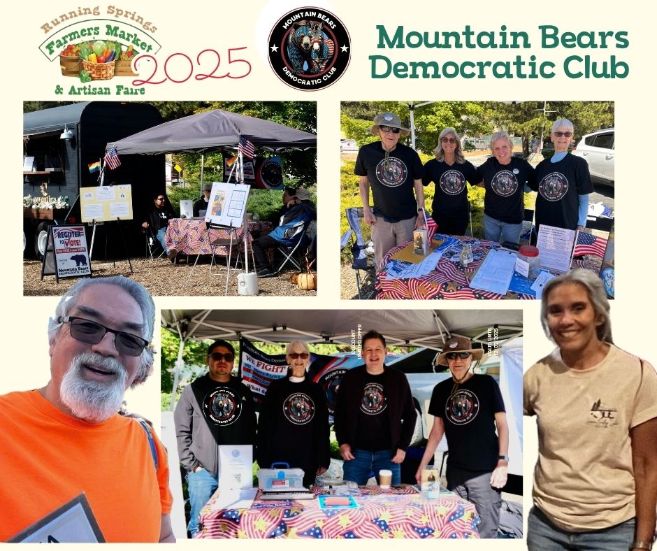 We are now completing what has been a successful Farmers Market for us. Few people registered to vote in this off-election year, but the many people, both vendors and visitors, who thanked us for being at the market remind us of how important it is to be visible and available. Our presence, our sign, and our story boards promote the Democratic Party, our values, and our Mountain Bears Democratic Club. We tell Democrats at the market how important it is to vote – even in mid-term and local elections. And we give people information and literature about our club, upcoming events, and issues such as proposition 50.