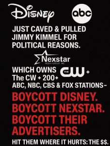 You can make a difference!Because of Jimmy Kimmel’s mild critique of the MAGA response to the assassination of Charlie Kirk, ABC, a division of Disney, canceled his show indefinitely, but due to the massive backlash from consumers canceling subscriptions to Disney+ and Hulu (almost $4 billion in lost revenue, by some accounts), Kimmel was reinstated …