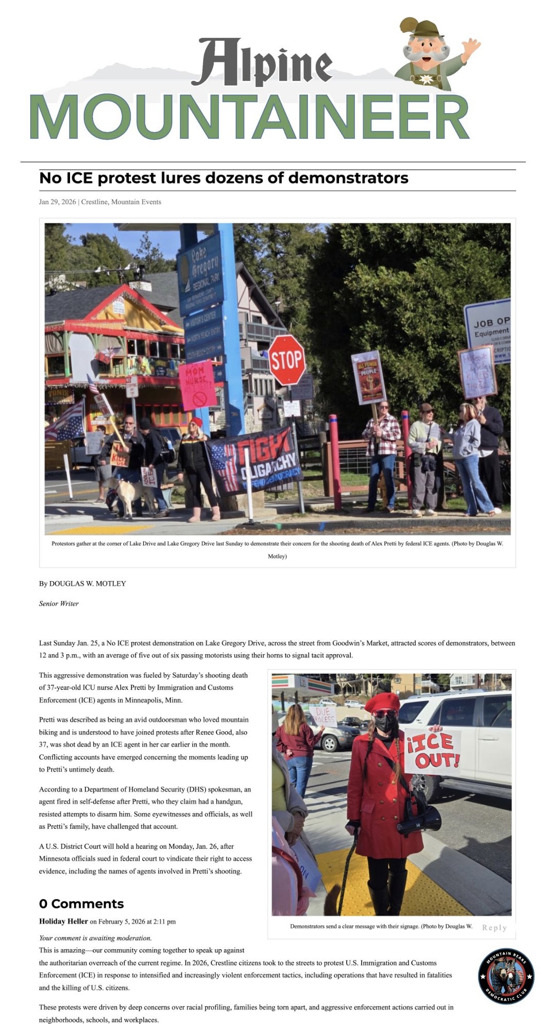 PLEASE THANK THE ALPINE MOUNTAINEER FOR COVERING THE CRESTLINE GRASSROOTS PROTEST! While legacy media is shying away from protest coverage due to backlash from right wing voters and donors, we need to thank Alpine Mountaineer for caring about democracy in its coverage. Click the above link or send your letters to the editor to PO Box 4572 Crestline, CA 92325-4572. Make sure you send us a copy so that we can publish as well. You can also call (909) 589-2140. Additionally, alert us to newspaper coverage we might have missed. If our voices are sustained and loud enough, the media will have no choice but to pay attention.