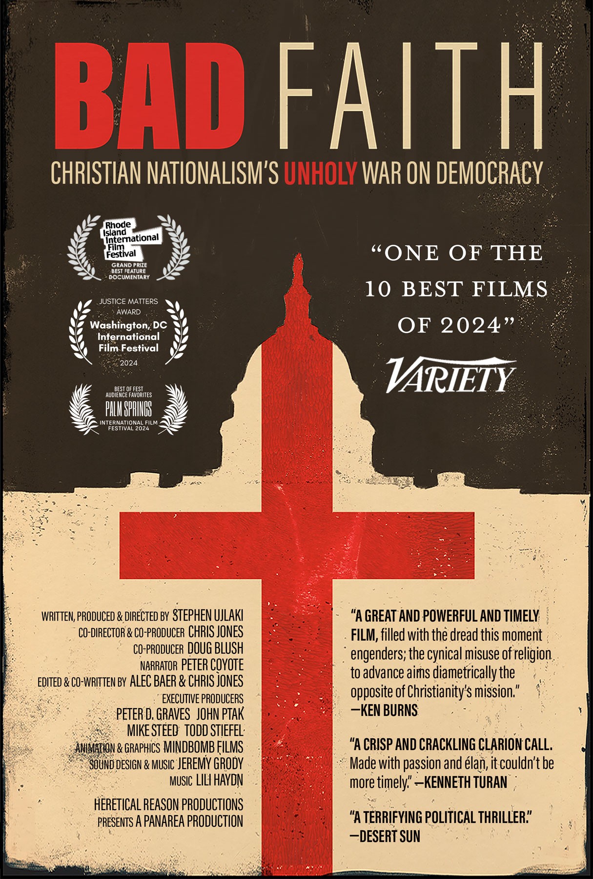 Bad Faith explores the dangerous rise of Christian Nationalism in the United States. Part archival chronicle, part exposé, the film reveals the secretive political machinery that has relentlessly sought to weaken and destroy American democracy in order to promote its authoritarian vision.