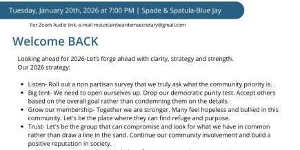 The Mountain Bear Democratic Club Demsgiving Potluck was a wonderful success with 50+ in attendance! Santa made a surprise appearance and our MBDC Bear danced through the room spreading cheer. A huge thank-you to our Democratic candidates — @tessaforca, @claiborneforcongress, and @paulforca23 — for braving the weather to meet with our mountain residents. Great food, …